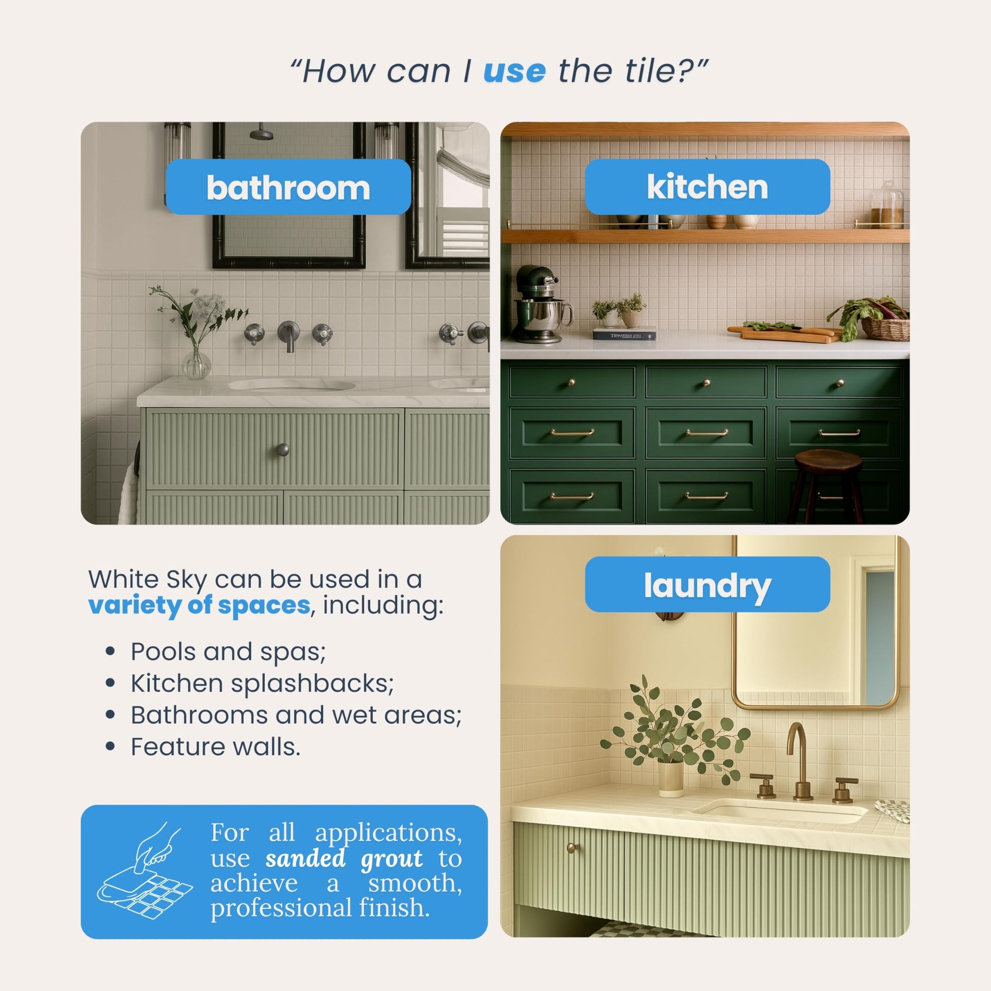 - {Tile Installation}: Requires a thin layer of adhesive for secure attachment. Use non-sanded grout for a smooth, professional finish.