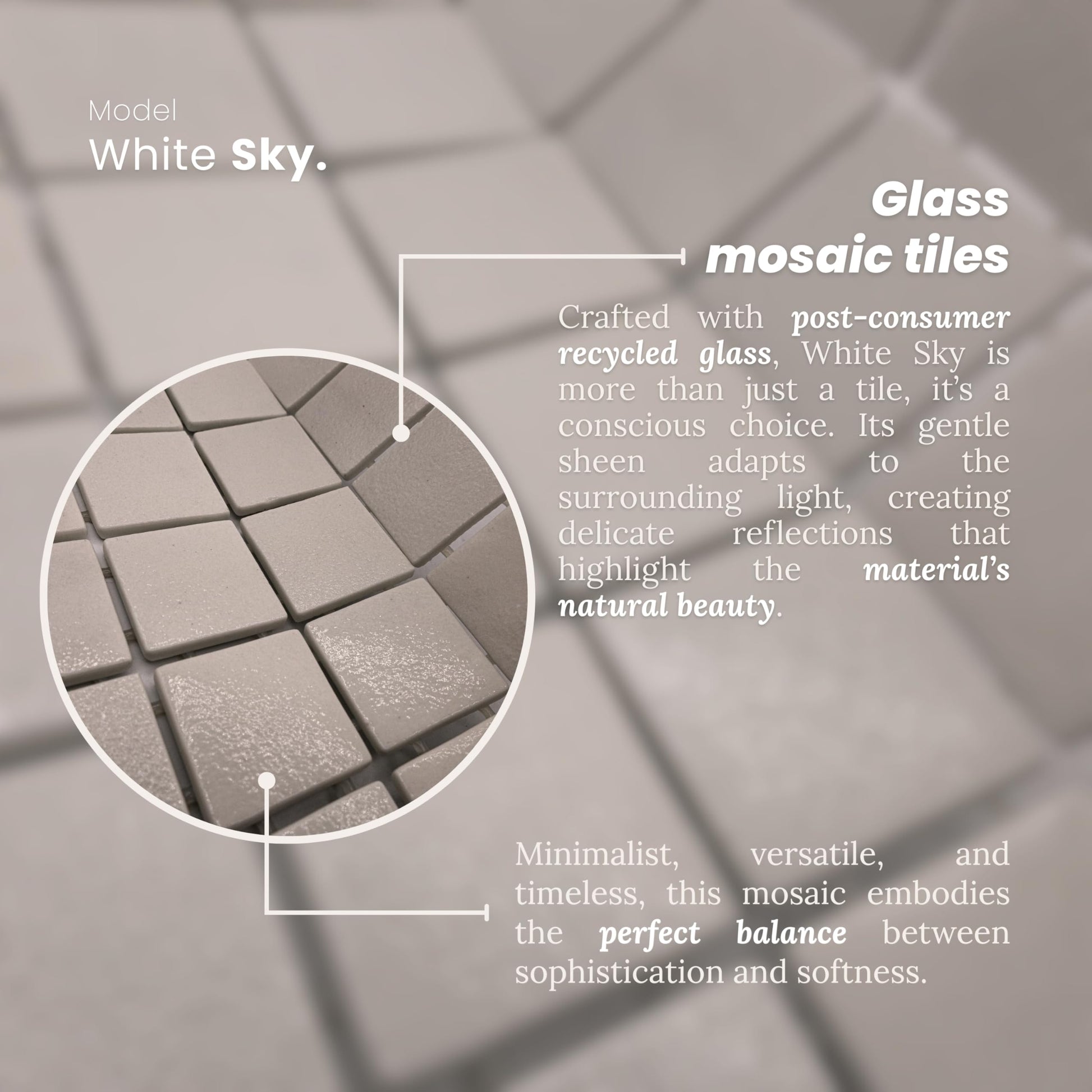 - {Tile Material}: Our recycled glass mosaics are produced using post-consumer glass through Sintered Technology.
